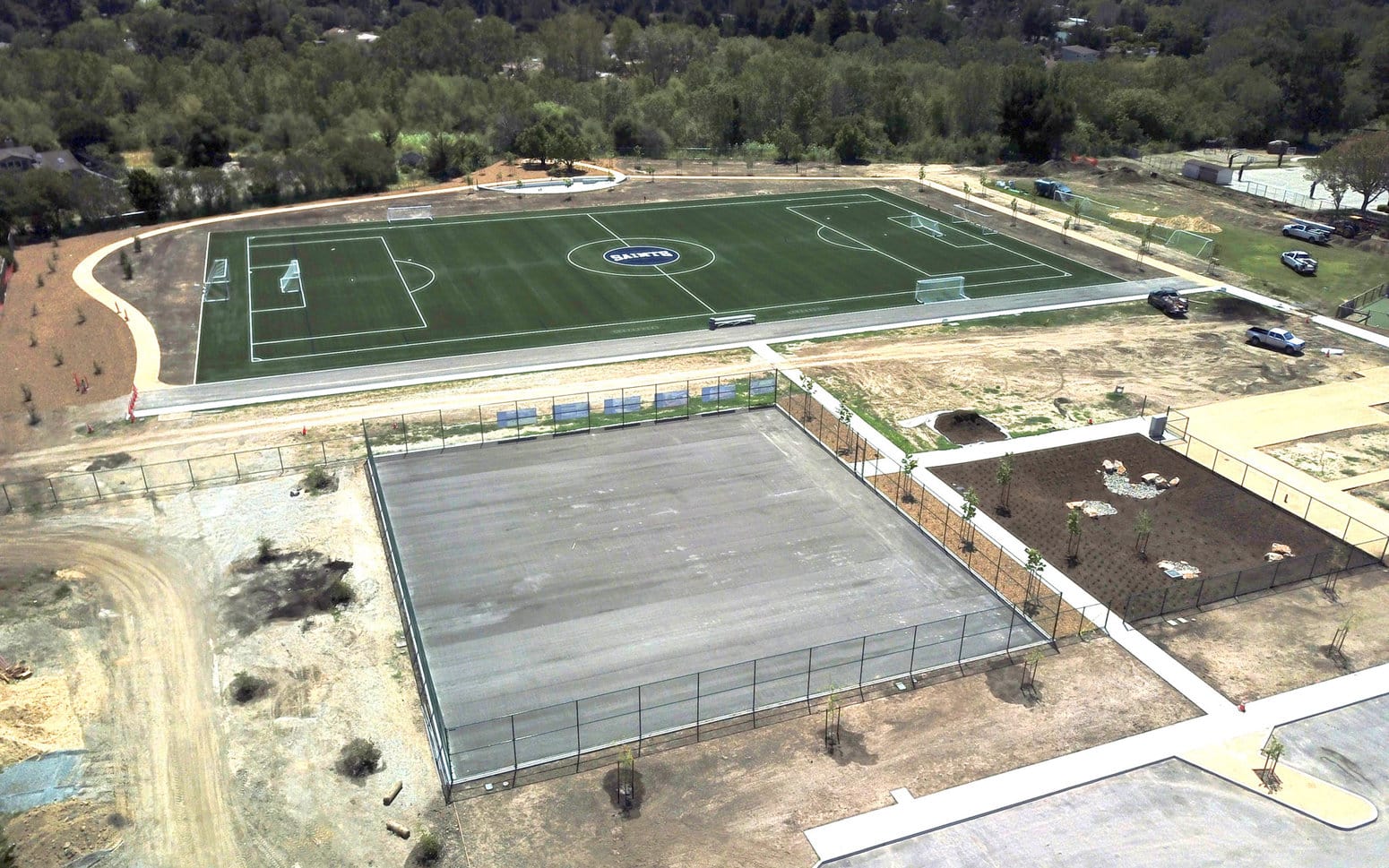 All Saints Day School elevated their athletic and education curriculum with a campus expansion that began in 2020. The project converts eight acres of previously underdeveloped land into a new soccer/athletic field, short straight-away running track, tennis courts, amphitheater, and planting areas. The new synthetic turf field and track converts a previous large natural grass play lawn and removes the existing irrigation and water use.